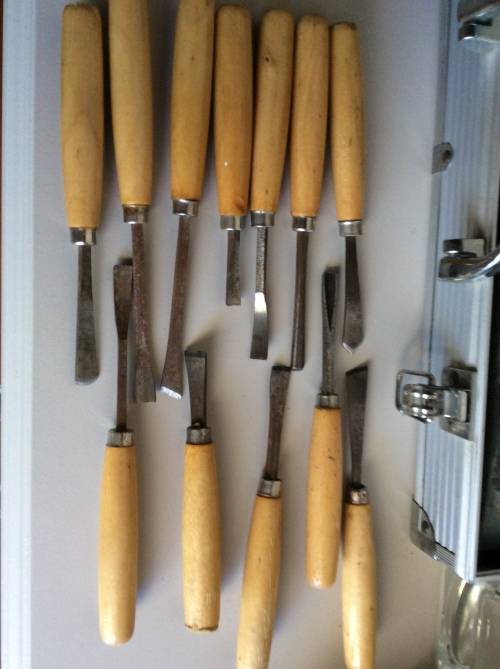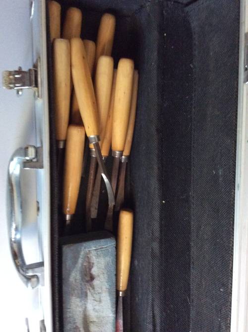 A used set of 12 wood carving chisels incl a sharpening stone & handy carry case