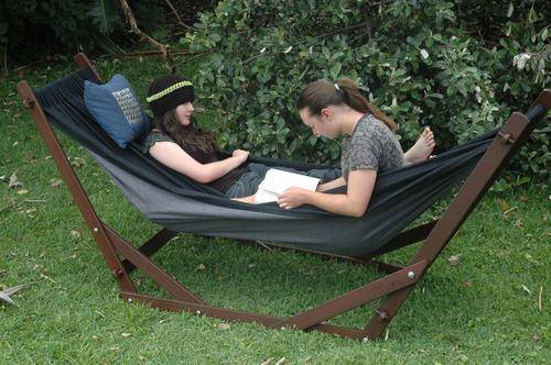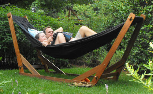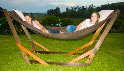 Sturdy UNIQUE wooden hammock stand , made from Balau wood - includes removable sleeping hammock. The portable hammock stand is flat packed in a bag. The wooden lounger is easy to assemble, includes simple instructions and is very stable, strong and hardwearing. The hammock stand handles uneven surfaces eg. rough lawns and soft beach sand. The extra large hammock is extremely strong and durable and easily removed for washing. The most comfortable sleeping hammock around.