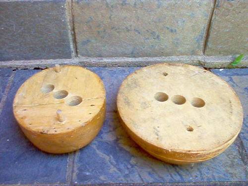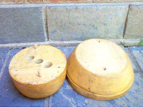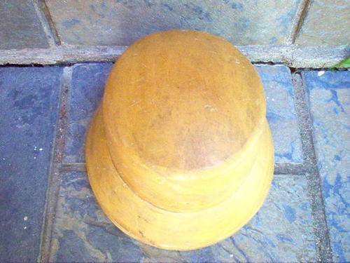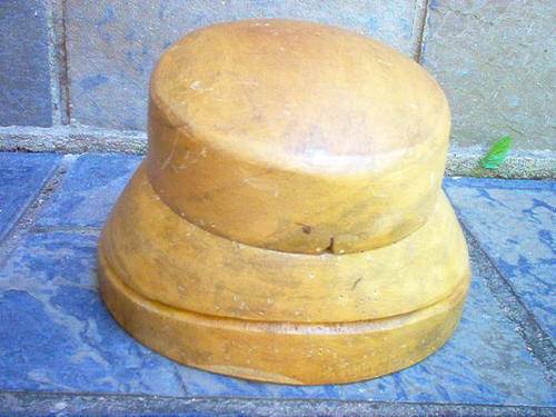 A LOVELY OLD WOODEN HAT BLOCK MEASURING 15CM HIGH AT THE HIGHEST FRONT, 23CM DIAMETER ACROSS THE BASE AND APPROX. 72 CM IN CIRCUMFERENCE. NO MAKERS MARKS BUT A GOOD SOLID PIECE.