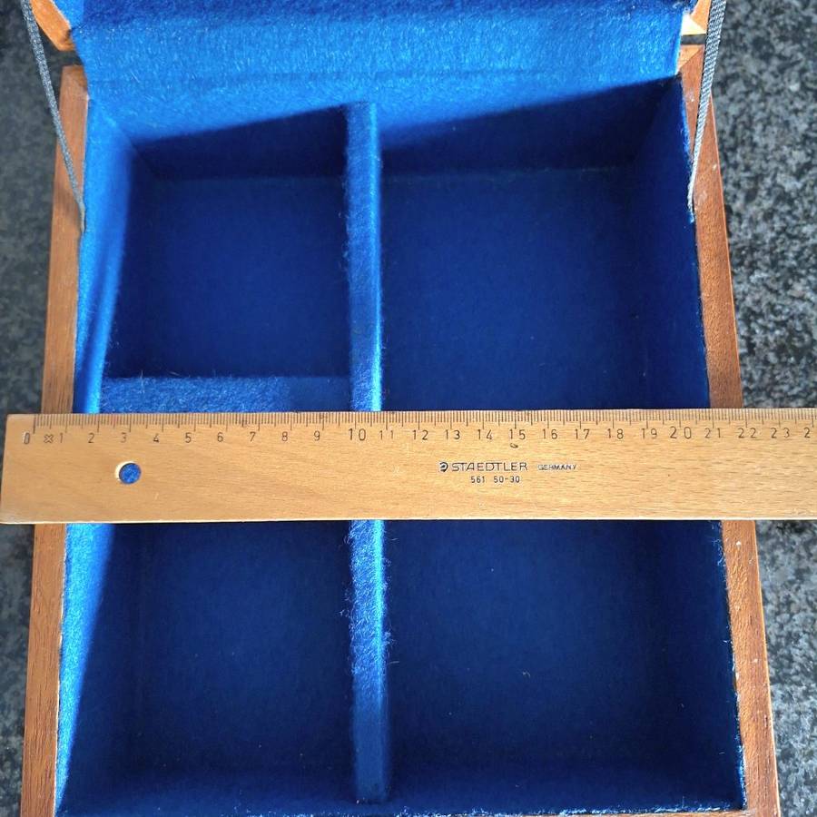 A big nicely made jewelry box. Lined with blue. In good used condition. Some scuffing underneath the box. Please look at the pictures carefully and dont hesitate to ask any questions.