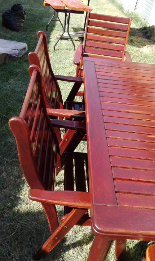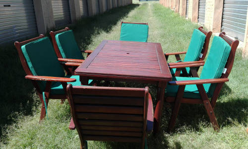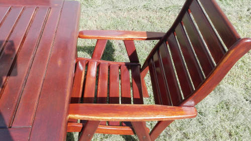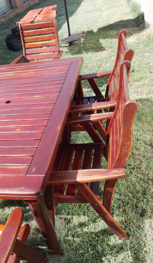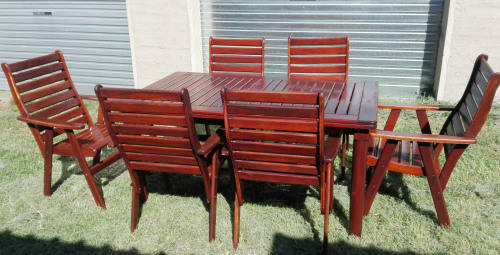 THE SET COMPRISES 7 PIECES, ONE TABLE 75cmX 150cm AND 6 CHAIRS. NOT SURE WHAT TIMBER IS USED...IT IS IN GOOD CONDITION. INCLUDED ARE 6 CUSHIONS, ONE FOR EACH CHAIR. NOTE,NO POSTAGE ON THIS ITEM , TO BE COLLECTED IN JOHANNESBURG.