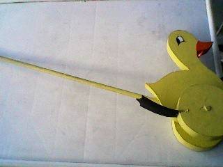 WOODEN WALKING DUCK. HAND MADE. WHEELS FOR FEET.