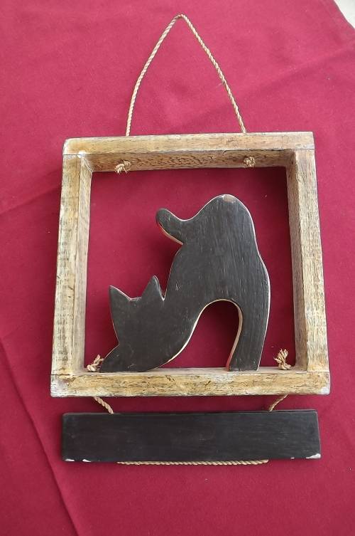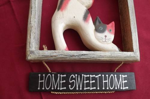 Wooden wallhanger with cat in wooden frame and "HOME SWEET HOME plate.Frame 20 x 20cm.Good condition
