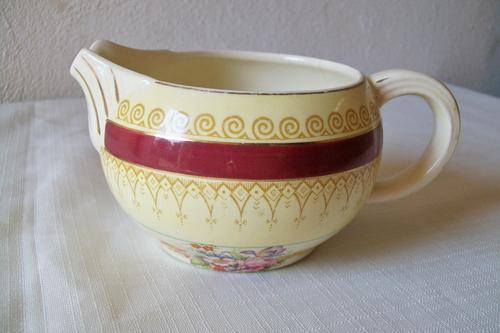 Wood's Ivory Ware Milk Jug. markings on the bottom : " Buckingham " and makers mark as illustrated. Dated to 1930's. Jug is 7cm high and a diameter of 10cm.