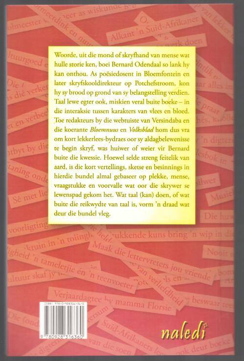 Toe redakteurs by die webtuiste Versindaba en die koerante Bloemnuus en Volksblad hom dus vra om kort lekkerlees-bydraes oor sy aldagbelewenisse te begin skryf, was huiwer of weier vir Bernard buite die kwessie. Hoewel selde streng feitelik van aard, is die kort vertellings, sketse en besinnings in hierdie bundel almal gebaseer op plekke, mense, vraagstukke en voorvalle wat oor die skrywer se lewenspad gekom het. Wat taal (kan) doen, of wat buite die reikwydte van taal is, vorm "n draad wat deur die bundel vleg..