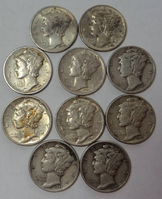 World SILVER Sets: 10 x USA Mercury Dimes struck during Second World War