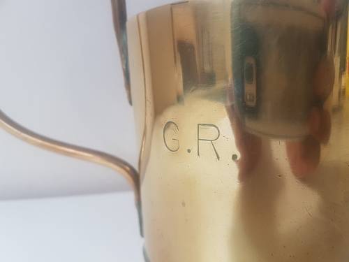 14 cm high and 18 cm wide, including handle. Solid brass weighs 570 grammes. Attractive display piece for your bar, den, militaria display shelf, etc. Excellent working condition.