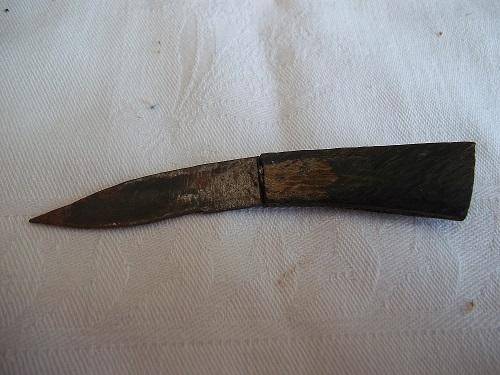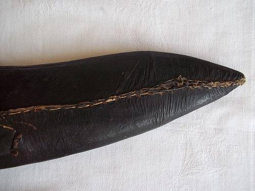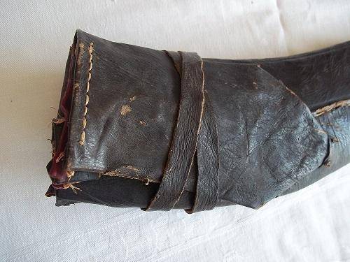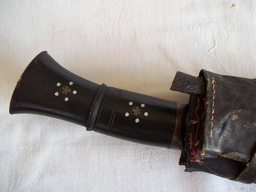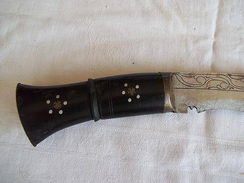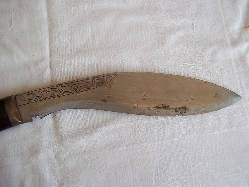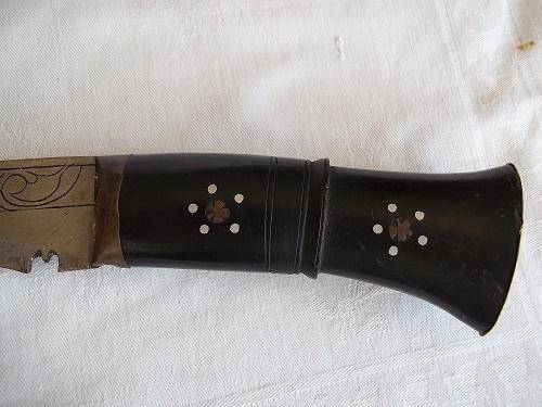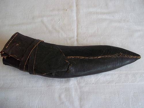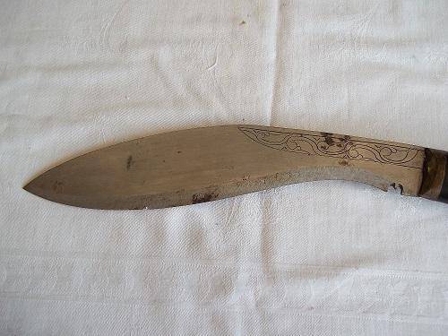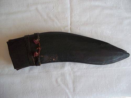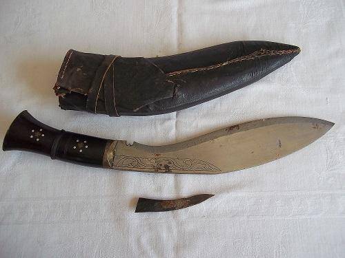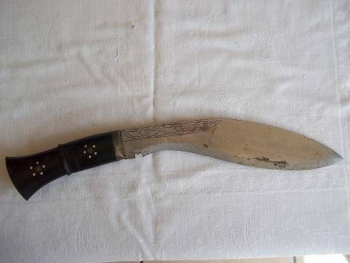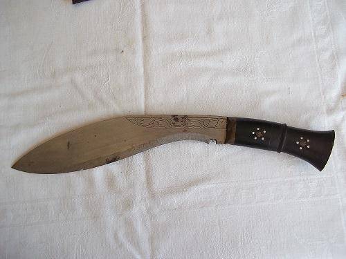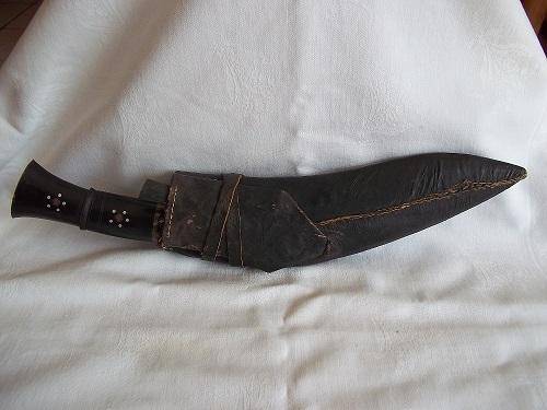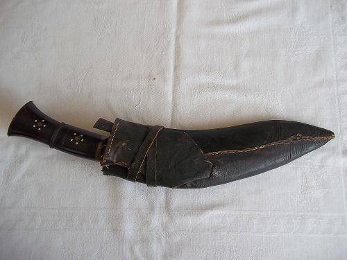 World War 2 Desert Sirupate Kukri dagger with scabbard. During World War 2, the Gurkhas fought beside the Allies in North Africa. They often favoured the Kukri knifes to take into battle over the Issued models. This knife is one brought back by a South African soldier who did duty in North Africa. The knife is still in its original leather scabbard, but is missing one of the 2 small knives which were used for sharpening and maintaining the Kukri. The knife is in excellent condition, except for a small knick on the blade. It has 5 white dots in 2 places on each side if the handle, with small brass inlays in the centre of the dots. The back & front of the handle are also brass. The knife measures 38cm from tip to tip. The scabbard was made from wood, covered by hand stitched leather. The leather has become hard due to age. A truly historic item for the true collector.