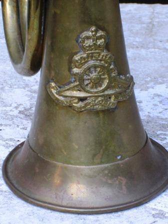 World War 2 Royal Artillery of Canada captain's brass bugle with crest and motto "Ubique Quo Fas et Gloria Ducant''.