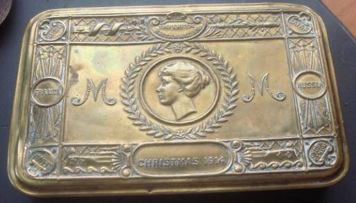 Christmas 1914 was unique. There was general optimism that the war which started in Aug 1914 would be over soon and troops would be home for Christmas. When it became evident that troops would spend Christmas away from home, during November 1914, an advertisement was placed in the national press inviting monetary contributions to a "Sailors and Soldiers Christmas Fund", which had been created by Princess Mary, the 17 year old daughter of King George V and Queen Mary. The fund's purpose was to provide everyone who would be wearing the King's uniform on Christmas 1914 with a "gift from the nation". The response was overwhelming and it was decided to spend the money on an embossed brass box, based on a design by Messrs Adshead and Ramsey. Contents varied from tabocco, cigarettes, cake, sweets, spices, chocolates, depending who it was sent to. Great efforts were made to distribute the boxes in time for Christmas and 355 000 were successfully delivered.