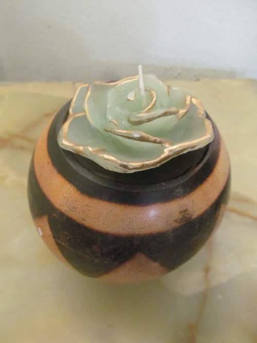 TOGETHER WITH THE MONKEY FRUIT CANDLE IS A LIGHT GREEN TEALIGHT CANDLE WITH PROMINENT GOLD TRIM CRAFTED IN THE APPEARANCE OF A ROSE. THE ITEM IS IN PERFECT CONDITION. 2.7cm HEIGHT.....7cm DIAMETER