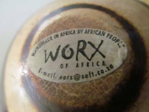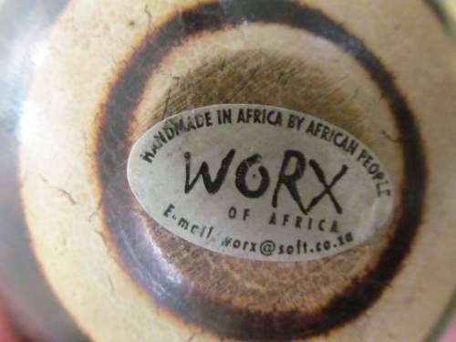 THE ITEMS ARE - A "WORX OF AFRICA" GENUINE MONKEY BALL/APPLE FRUIT, DECORATED IN THE TRADITIONAL AFRICAN PATTERNING, HOLLOWED AND COMPLETELY FILLED WITH BLACK CANDLE WAX. THE ITEM WAS "HANDMADE" IN WHITE RIVER NEAR THE PAUL KRUGER PARK. THE SKIN OF THE ITEM IS FIRST REMOVED AND THEN THE FRUIT IS DRIED FOR A PERIOD OF 12 MONTHS AFTER WHICH IT IS THEN DECORATED. THE ITEM HAS A LABEL UNDERNEATH - "HANDMADE IN AFRICA BY AFRICAN PEOPLE, WORX OF AFRICA". IT IS WITHOUT ANY USE OR DAMAGES AT ALL. 9.5cm HEIGHT.....10cm DIAMETER