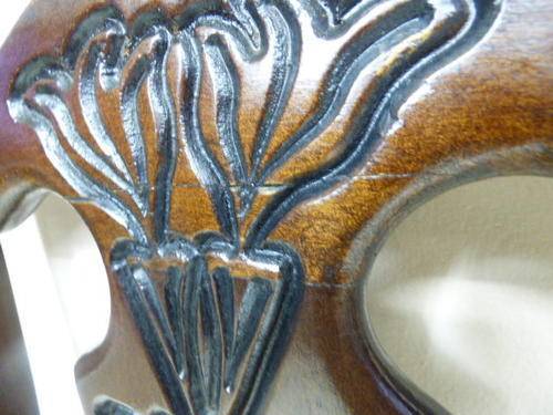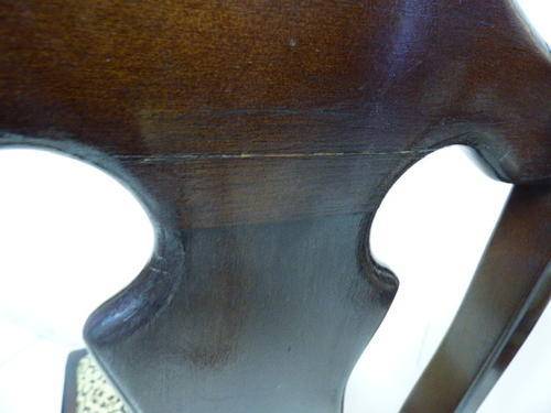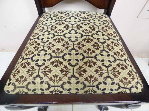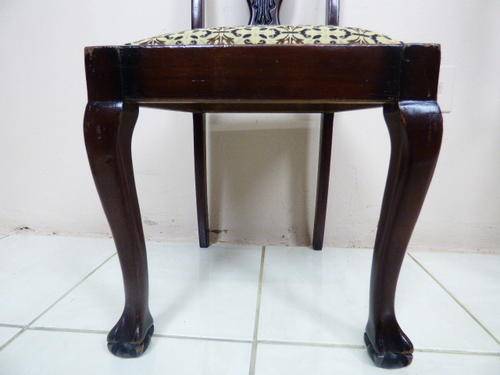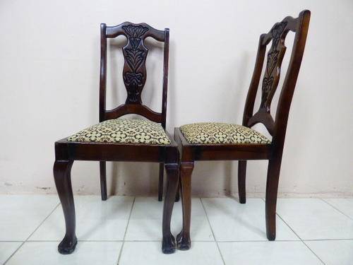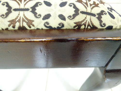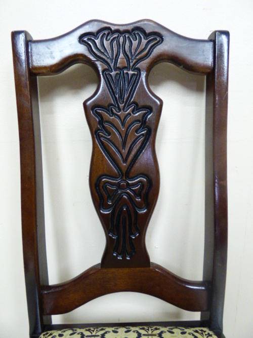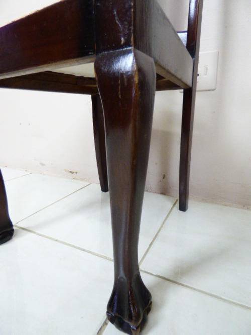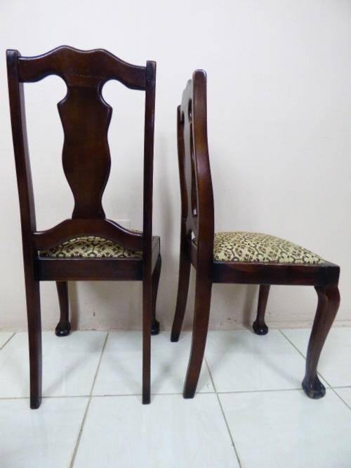 THESE 4 GORGEOUS SOLID IMBUIA, BEAUTIFULLY CARVED DINING ROOM CHAIRS ARE IN GOOD CONDITION, THE WOOD IS SOLID AND STURDY, HOWEVER AS SEEN IN THE PICS THEY HAVE A HAIRLINE CRACK ON THE BACK REST. THE SEATS HAVE RECENTLY BEEN RE UPHOLSTERED AND IS IN PERFECT CONDITION. THE CHAIRS MEASURE APPROXIMATELY 45cm x 46cm x 99cm HIGH,