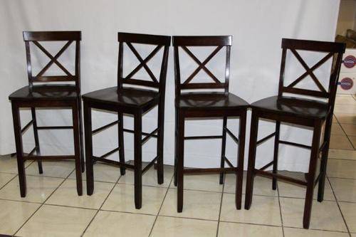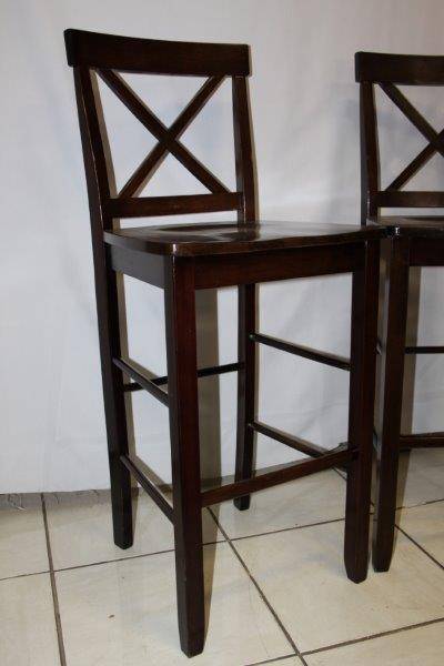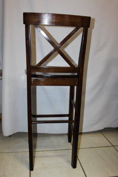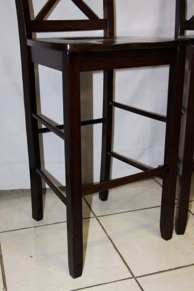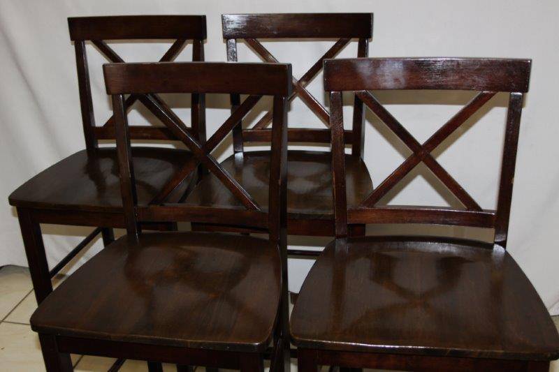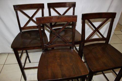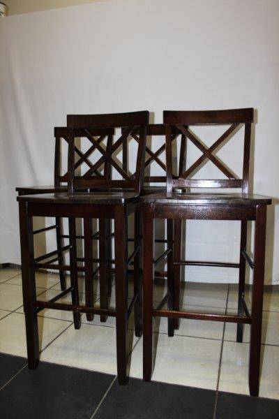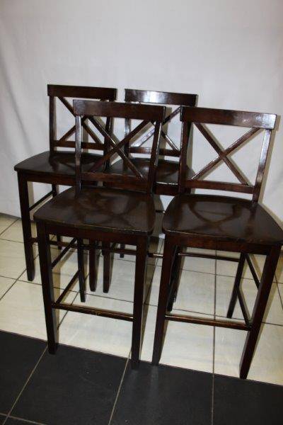 FOUR STUNNING HEAVY SOLID TEAK MATCHING BAR CHAIRS WITH AWESOME BACK RESTS AND DETAILING!!! THEY ARE IN EXCELLENT CONDITION AND THEY STAND FIRMLY ON THE GROUND; NONE OF THEM ARE WONKY AT ALL!!! THESE ARE CLASSIC SOLID HEAVY BAR CHAIRS!!! PLEASE VIEW THE PICS VERY CAREFULLY BECAUSE THE PICS FORM PART OF THE DESCRIPTION!!! WHAT YOU SEE IS WHAT YOU GET. POSTAGE AND PACKAGING WILL NOT BE POSSIBLE SO PLEASE ARRANGE FOR COLLECTION IN EDENVALE OR VIEW OUR OTHER SHIPPING OPTIONS.