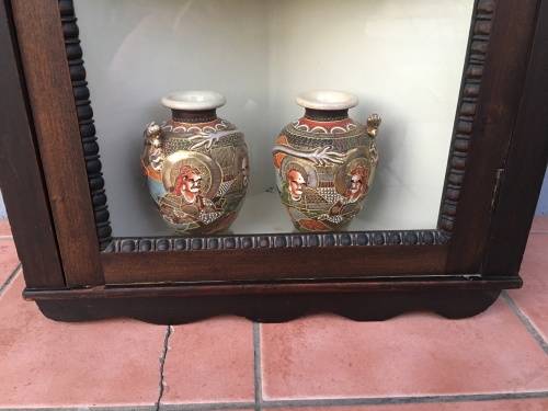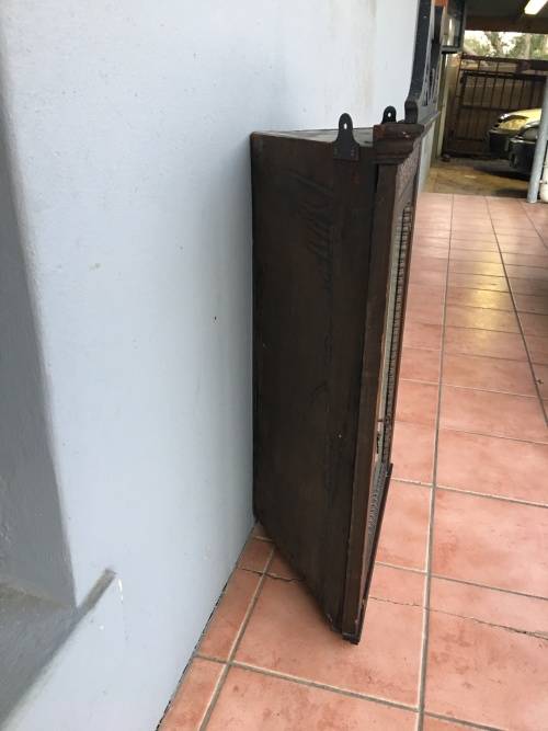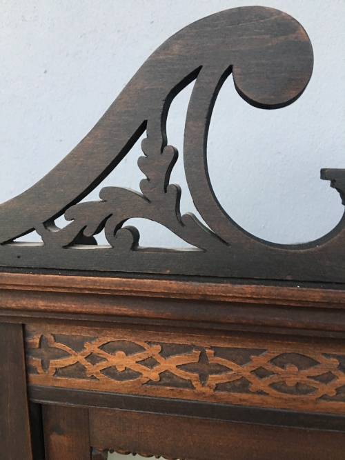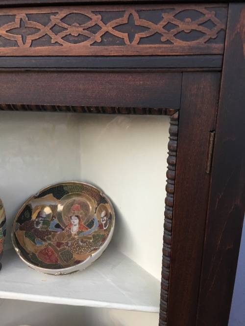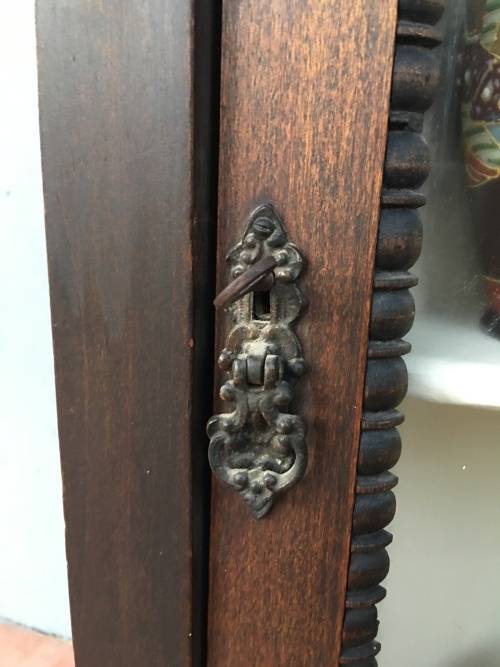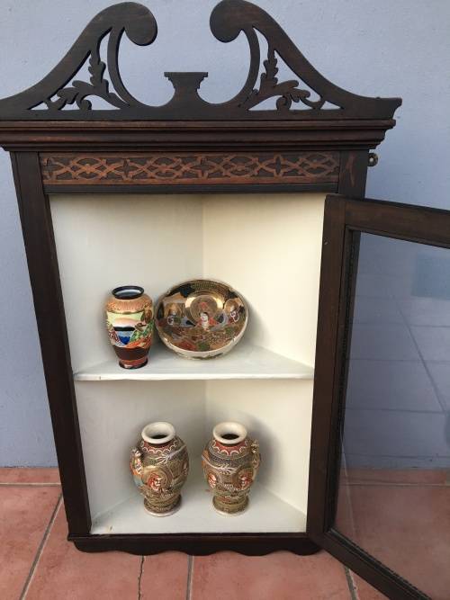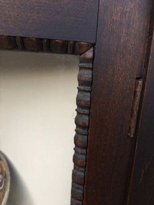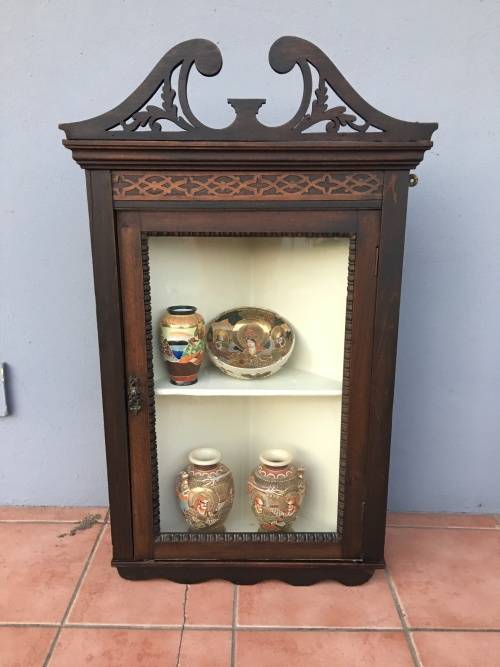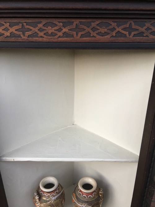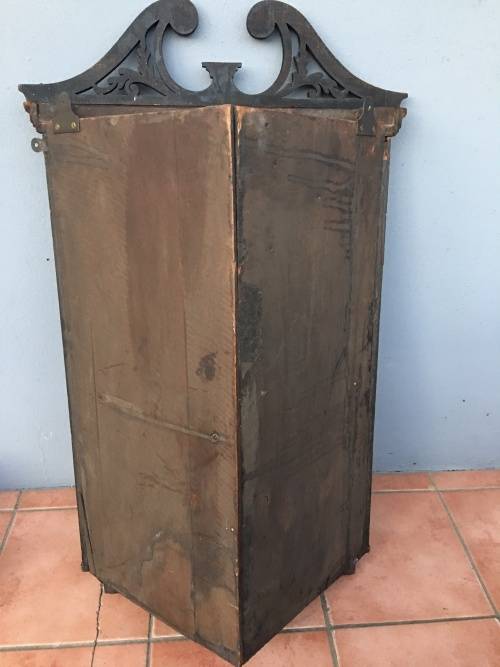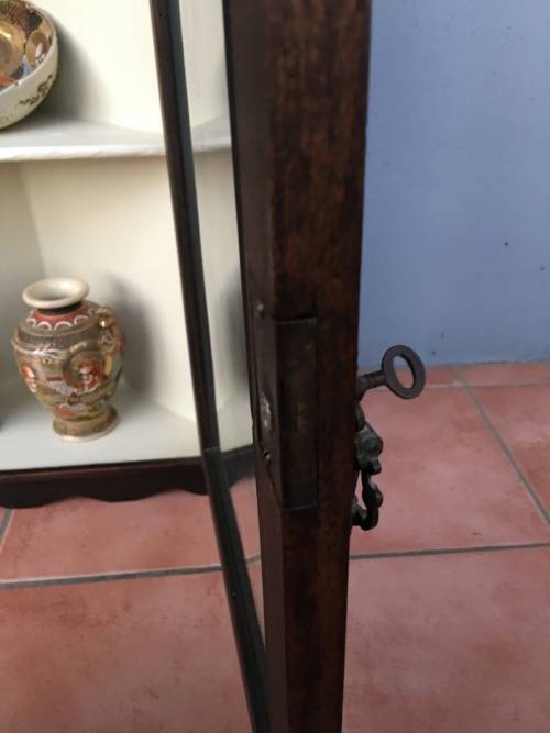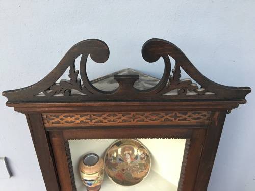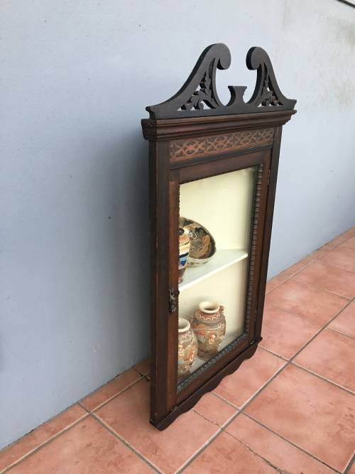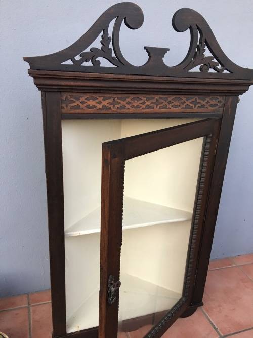 WOW !!!! A BEAUTIFUL MAHOGANY WALL MOUNTED CORNER CABINET WITH A GLASS DOOR AND WITH A STUNNING CARVED TOP DETAIL AND A CENTER SHELF THE INSIDE HAS BEEN LAID OUT WITH VINTAGE THICK VINTAGE WALL PAPER WHICH ADDS SO MUCH CHARACTER TO THIS CABINET , THE CABINET IS IN AN EXCELLENT CONDITION