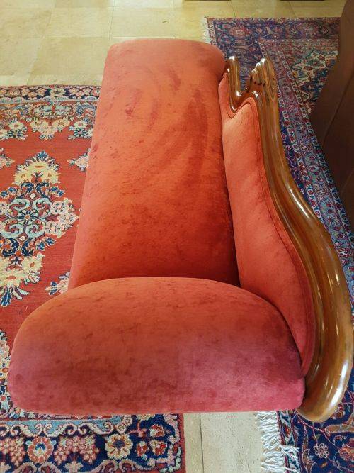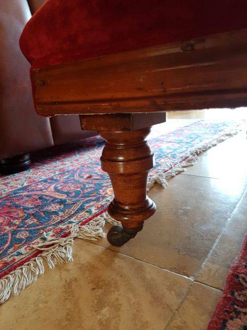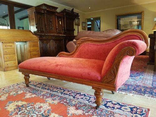 THIS IS A FABULOUS OPPORTUNITY TO ACQUIRE A GENUINE ANTIQUE VICTORIAN WALNUT CHAISE LONGUE OR DAY BED. THE FRAME IS OF SOLID WALNUT WHICH HAS MATURED OVER THE DECADES INTO A RICH WARM COLOUR AND THE DEPTH OF GRAIN SHINES THROUGH, THIS IS COMPLIMENTED MOST BEAUTIFULLY BY THE DEEP COLOUR OF THE FABRIC. IT HAS THE CLASSIC CURVED HIGH BACK WITH FINE SCROLLED CARVING AND THIS THEME IS CARRIED ON THROUGH TO THE LEGS ON CASTORS. IT WAS DESIGNED TO SIT AGAINST A WALL, AT THE END OF A BED OR AS A ROOM DIVIDER AS IT HAS A FLAT BACK. THIS CHAISE IS FIRM AND SUPPORTIVE WITH NO LOOSE JOINTS. IT MEASURES 60CM X 173CM X 83CM HIGH. A VICTORIAN CHAISE IN THE CLASSIC AND ELEGANT DESIGN WHICH WOULD GRACE ANY PERIOD HOME AND OF COURSE WOULD LOOK STUNNING IN A SITTING ROOM OR BEDROOM.