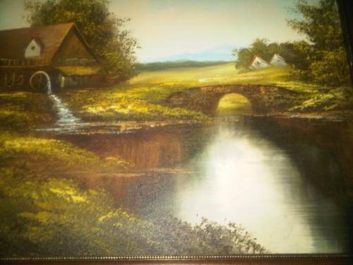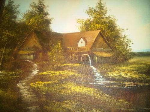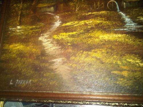 This is a wonderful scene depicting a cottage in the countryside with its own water mill and lake for fresh produce. There is so much detail in the house and the trees. This seems to be painted as Spring for you can see the colorful flowers on the lakes edge. This has been painted by a talented artist by the name L. Parker. Measurements : 65cm x 55cm.
