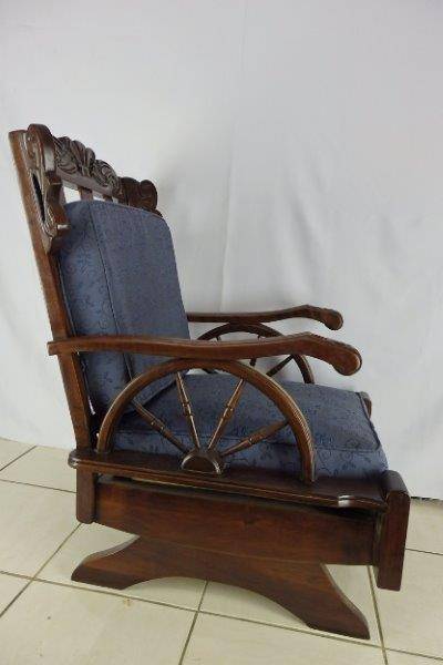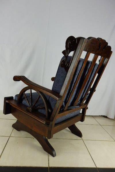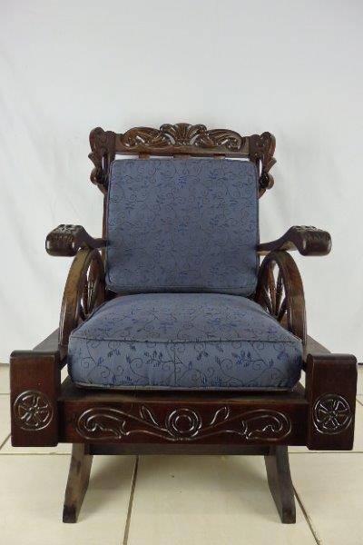 WOW!!! WE ARE OFFERING A BEAUTIFUL SOLID IMBUIA CARVED MECHANICAL ROCKING CHAIR WITH A TON OF CHARACTER AND IT'S IN FANTASTIC CONDITION FOR THE AGE!!! THE CHAIR IS SOOOOOO COMFORTABLE AND MAKES AN AWESOME READING CHAIR; PERFECT FOR NEXT TO A FIREPLACE, IN A STUDY, LOUNGE OR ON THE PATIO!!! THE CUSHIONS DEFINITELY REQUIRE SOME ATTENTION HOWEVER THEY ARE ALSO IN GOOD CONDITION FOR THE AGE. THE SIZE OF THE CHAIR IS APPROXIMATELY 720mm x 700mm x 1050mm HIGH. PLEASE VIEW THE PICS CAREFULLY FOR MORE DETAIL AND CONDITION - WHAT YOU SEE IS WHAT YOU GET! POSTAGE AND PACKAGING WILL NOT BE POSSIBLE SO PLEASE ARRANGE FOR COLLECTION IN EDENVALE OR WE CAN QUOTE FOR DELIVERY!!!