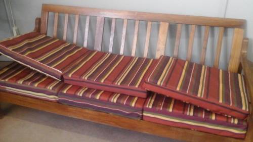 WOW A STUNNING POSSIBLY KIAAT WOODEN BENCH. BRAND NEW FOAM CUSHIONS THAT ARE WATERPROOF.