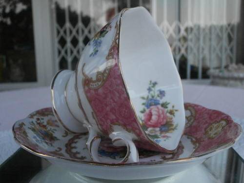 First made in 1944, Lady Carlyle by Royal Albert was slated to be discontinued, but due to customer outcry the pattern was not discontinued. It features an exquisite bouquet of fresh English flowers including roses, bluebells and forget-me-nots with pink and gold accents, and it is trimmed in gold. The Royal Albert Lady Carlyle pattern was designed in remembrance of the styles of the 18th century