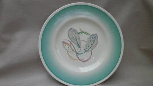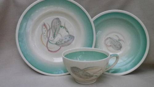 This is just the MOST gorgeous and charming Susie Cooper art deco design - so unusual with a wonderful sense of movement and lightness captured in the stunning feather motif in delicate hues of soft grey and mint, with touches of pink and orange.