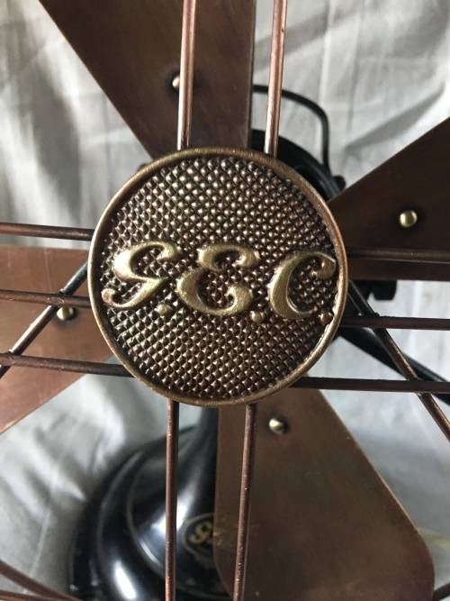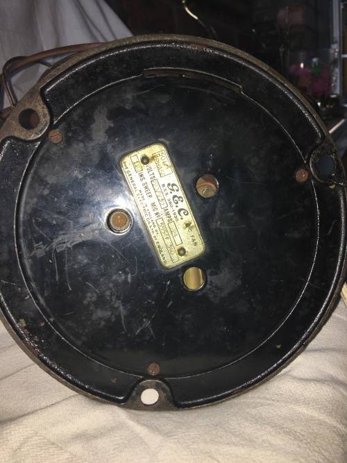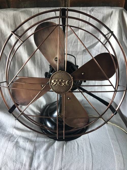 Beautiful made in England vintage original GEC fan with black base and brass cage, and four brass fan blades.