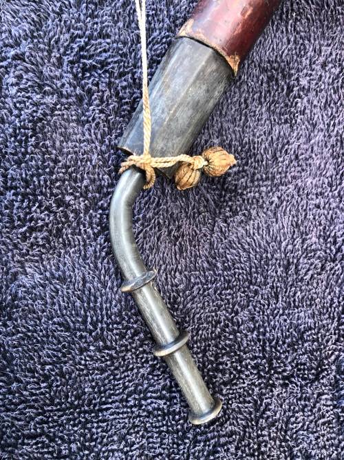 Pipe made from meerschaum between 1790 and 1810, lying form, turned wood pipe with horn mouthpiece and solid silver montur.