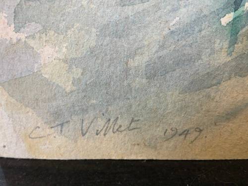 Dr Charles Theodore de Mornet Villet born in Cape Town in 1896. He qualified as a medical doctor in Cape Town and specialised in Ireland and practiced in Wynberg for many years, earning a reputation as a surgeon of exceptional skill. After he retired he settled in Worcester and continued with his hobbies of collecting succulents and painting. He painted for many years in watercolour capturing many unrepeatable Cape Town scenes and in oils on a variety of surfaces mostly board and canvas covered board often painted back and front.. He seldom signed his work like has forebear Jean Villet. He was an extremely competent artist experimenting with and following the impressionist style. He and his wife were also very involved in collecting succulents discovering many new species. He was generally known as Mornet and had two children, a son who became a photographer and worked mainly abroad and a daughter Cynthia who is also a talented artist. She currently lives in Kenilworth in Cape Town. Dr Villet died in Barbados in 1963 whist visiting his daughter who was living there at the time. Much of his work remains unsigned and is either stamped on the reverse with a studio rubber stamp authenticated by his daughter reading Cynthia Villet for C T Villet.