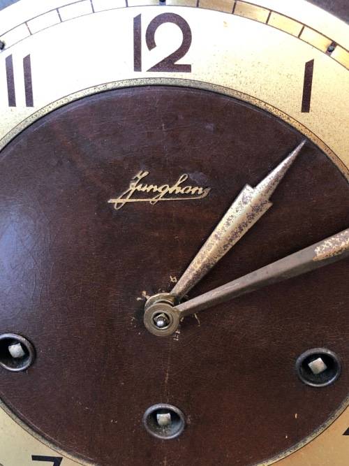 WOW !!! CLASSIC JUNGHAN'S BALL AND CLAW STYLED MANTLE CLOCK - NO KEY - IT IS WORKING BUT WILL STILL RECOMMEND A SERVICE - CHIMING HAS A GLICH AT TIMES - CHIMES ON THE HOUR , QUARTER , HALF AND THREE QUARTER