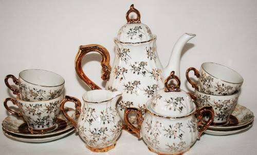 THE SET CONSISTS OF ( POT , MILK JUG , SUGAR BOWL , FOUR CUPS WITH SAUCERS
