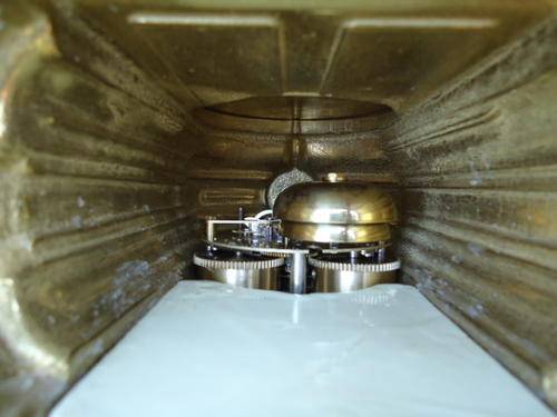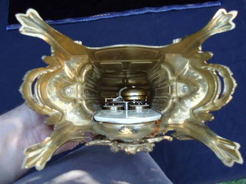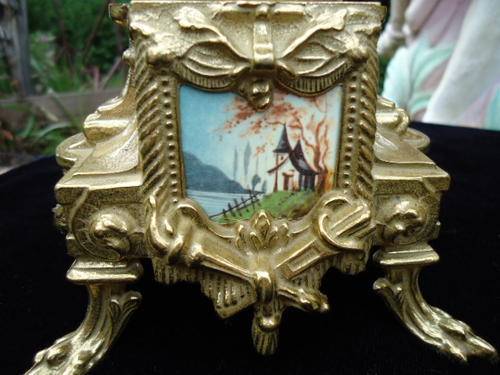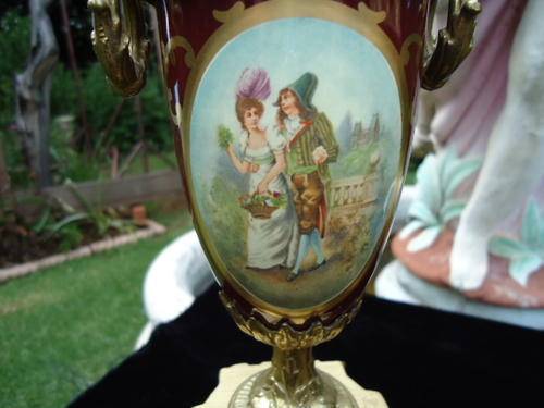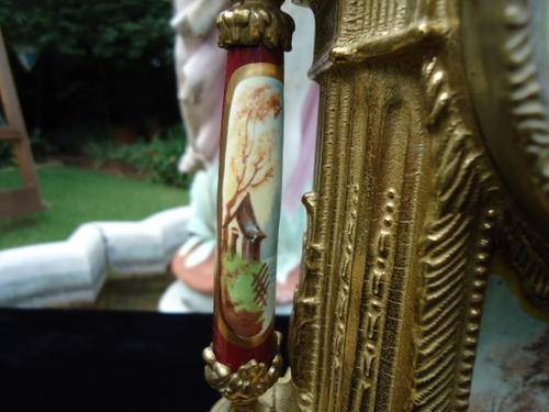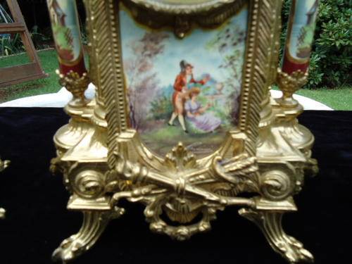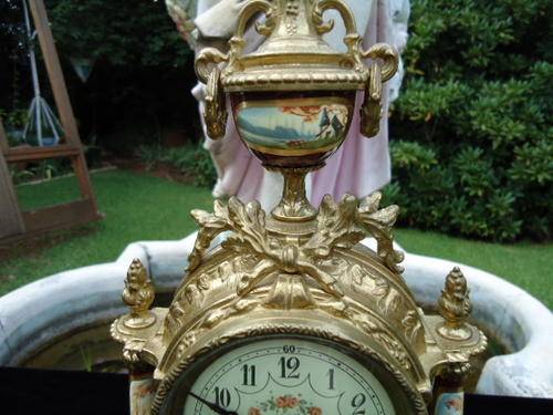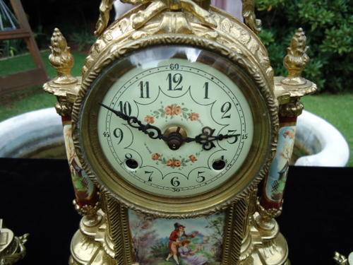 Franz Hermle porcelain and brass garniture clock set. Mantle clock with a transferware image on the front plaque, two columns on the sides, and top urn form finial resting on four claw feet. Metal dial with Arabic numerals. Eight day time and strike movement. Marked on the movement "Franz Hermle, Two (2) Jewels, Unadjusted, Made in Germany, 130-070." With a pair of porcelain urns with a transferware pattern on a brass base with four clawed feet. With key.MEASUREMENTS: Clock 16-1/4" x 9". Each urn 12-1/2" x 5-1/8". CONDITION:Perfect running order. No defects noted.Also note the signature on handpainted porcelain plaques.DUE TO DELICATE NATURE OF THIS ITEM IT WILL HAVE TO BE EITHER COLLECTED OR SENT VIA COURIER.COST TO BE DETERMINED AT END OF AUCTION WITH LOCATION OF WINNING BIDDER!!!!!!!