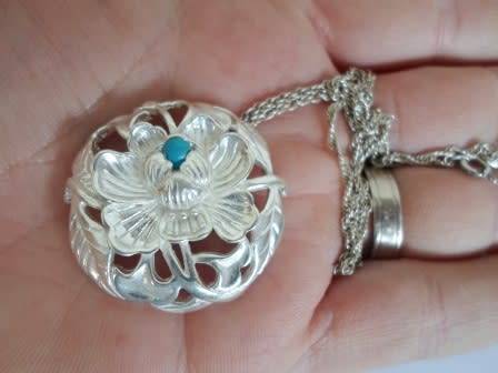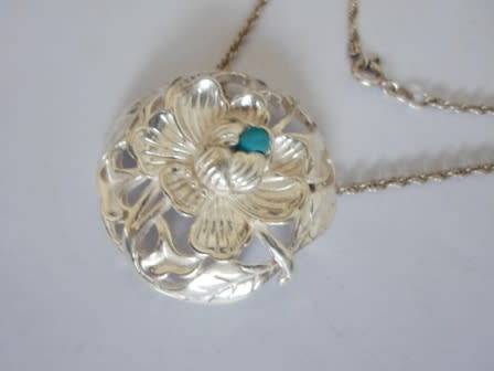 WOW!! LARGE HEAVY STERLING SILVER & TURQUOISE LOTUS PENDANT WITH CHAIN 18,1g WOW!!