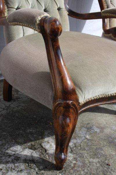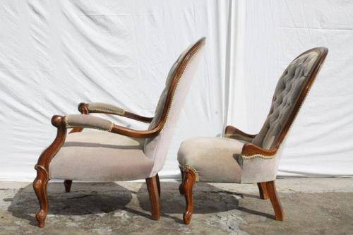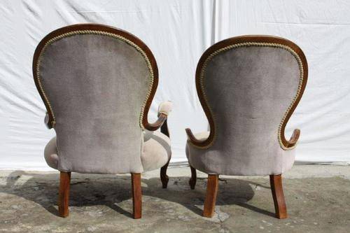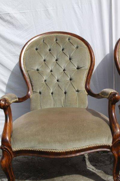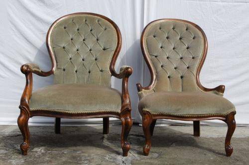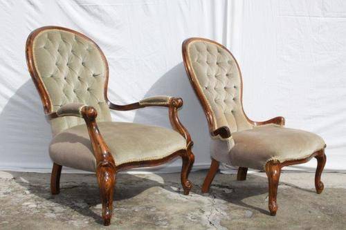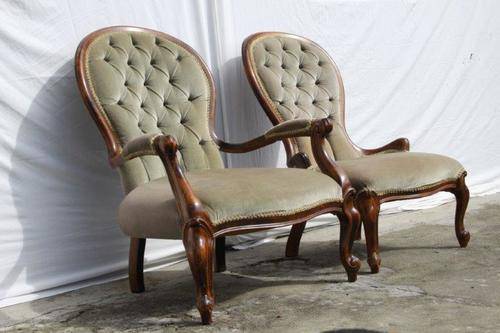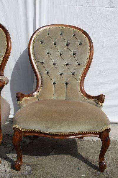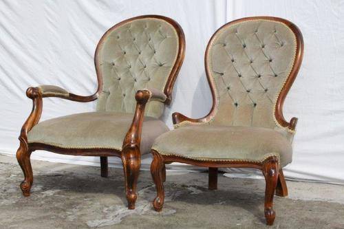 WE ARE OFFERING TWO ABSOLUTELY MAGNIFICENT VICTORIAN KING & QUEEN CHAIRS IN EXCELLENT CONDITION FOR THE AGE! THE CHAIRS ARE FIRM AND STABLE, THE WOOD IS PRISTINE AND THE FABRIC IS FANTASTIC! THESE CHAIRS ARE IN A LEAGUE OF THEIR OWN AND ABSOLUTELY STUNNING! THEY WORK SO WELL IN A DRESSING ROOM, IN FRONT OF A BED OR ON A PATIO FOR READING AND RELAXING!