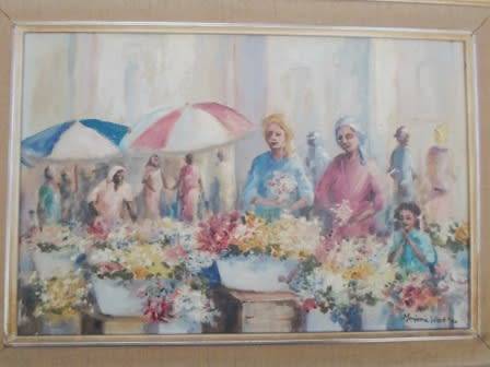 WOW! MARJORIE WEST "FLOWER SELLERS" OIL ON BOARD 450 X 300mm STUNNING PAINTING WOW!!