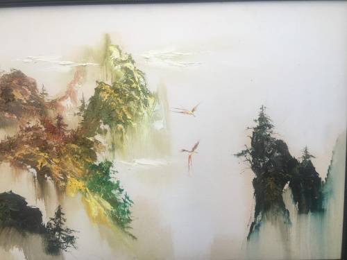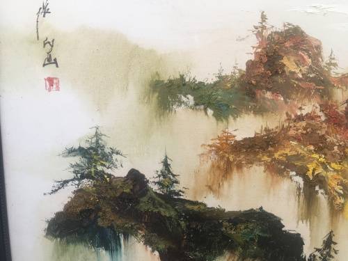 WOW !!! STUNNING LARGE FRAMED PALETTE OIL ON BOARD CHINESE LANDSCAPE PAINTING WITH CALLIGRAPHY signed
