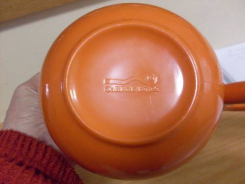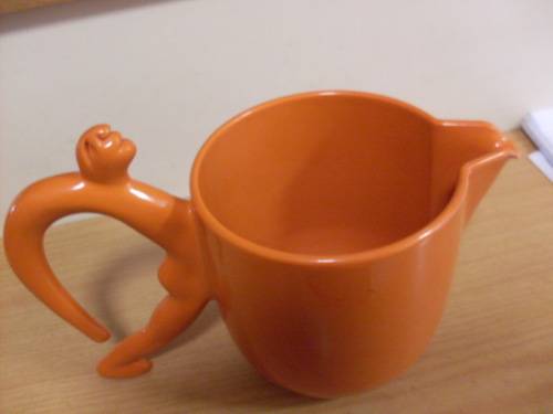 WOW....THIS IS A VERY RARE ORANGE COLOUR PLASTIC ICE TEA JUG WITH THE MAN SHAPE FIGURE HANDLE BY CARROL BOYES SIZE IS 19 1/2 CM X 13 C X 27 CM...HAS CARROL BOYES MARKINGS...UNUSED