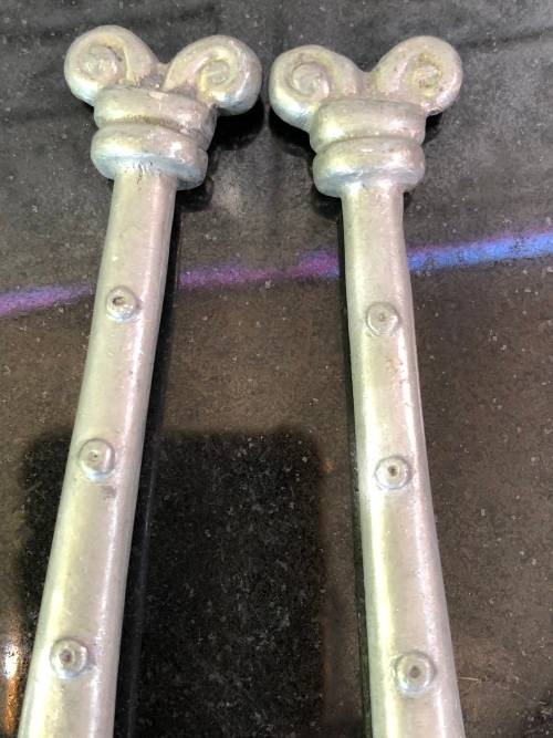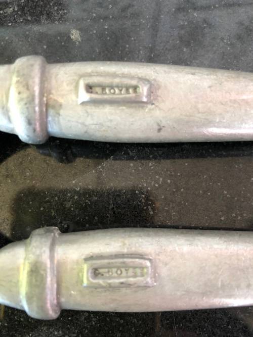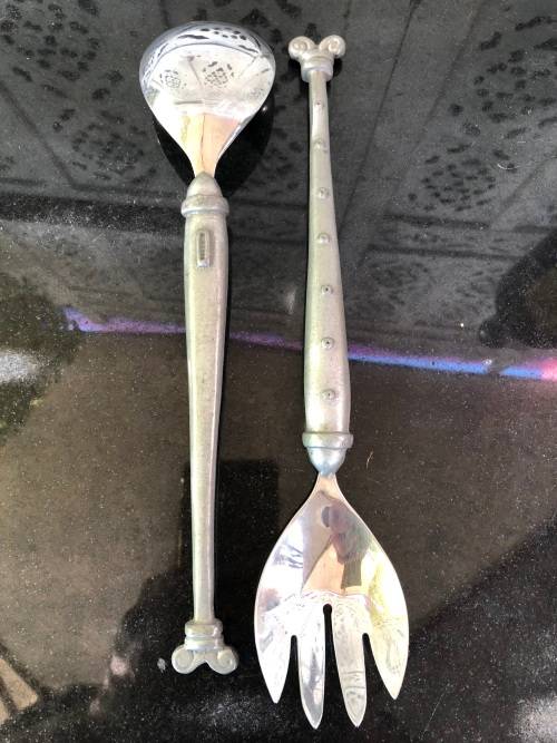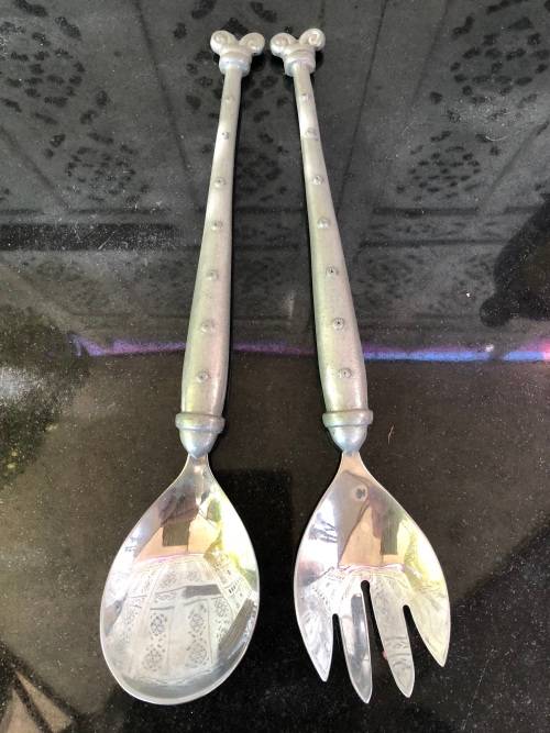 WOW !!! VINTAGE HEAVY CARROL BOYES PEWTER SALAD SERVERS - SPOTTED ARIES PATTERN - CLEARLY MARKED