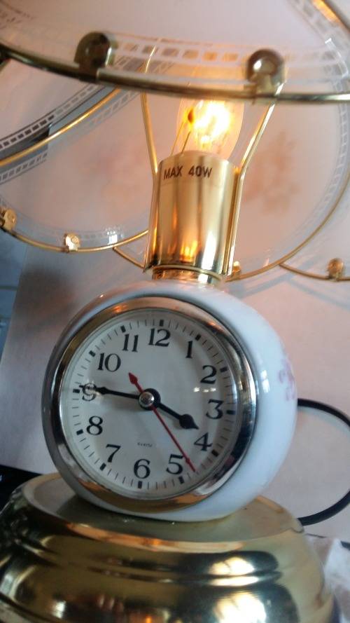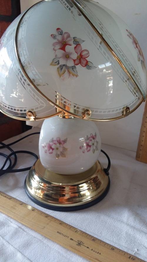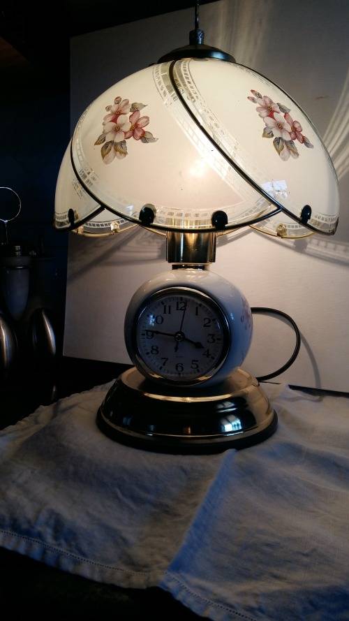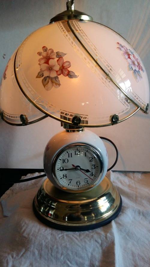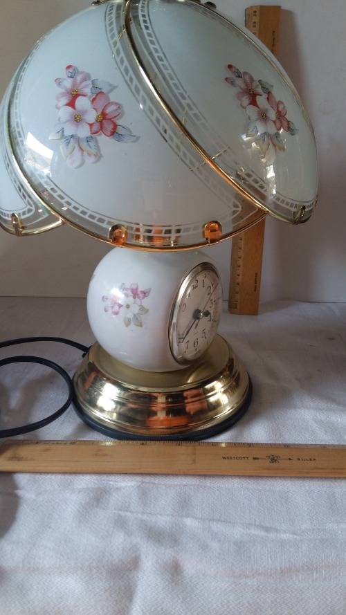 Wow,Vintage Porcelain Touch Lamp Quartz Clock Lamp With Painted Panel Glass Lamp Shade. Stunning and in Pristine working condition. 4 Taps for different light dimming stages.