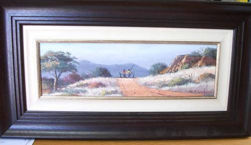 this wonderful painting by the well known late wp grobler, is in oil and is framed on board, the painting itself is 45 x 15 cm, postage paid by purchaser, normal postage r50 in sa