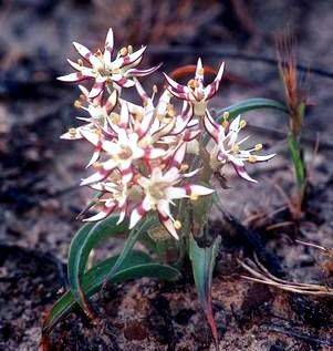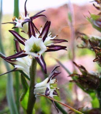Wurmbea is a genus is the Colchicaceae family from sub-saharan Africa and Australia. The rootstock is a corm and flowers are star or trumpet-shaped. Wurmbea spicata grows to 20 cm tall. It does most of its growing during winter. It has a dense inflorescence of fragrant star-shaped cream flowers that can be with or without dark margins. Wurmbea spicata will flower in spring and go into dormancy during summer. This species is very well suited to pot culture.
