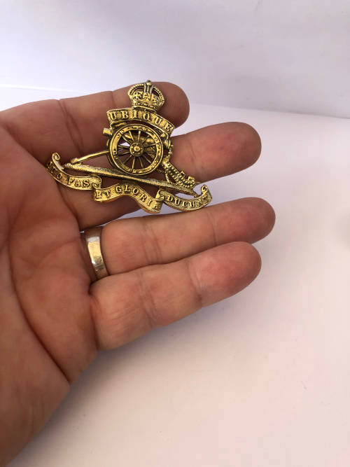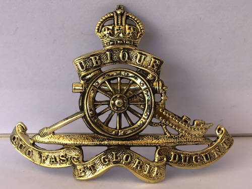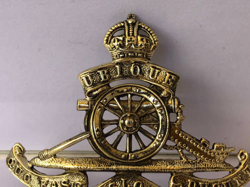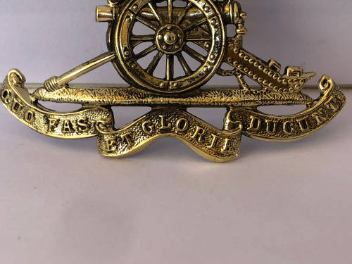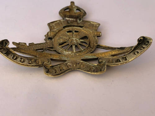 WW1 BRITISH ROYAL ARTILLERY CAP BADGE- UBIQUE QUO FAS ET GLORIA DUCUNT - BRASS WWI THE GUNNERS - THE BACK CLIP IS MISSING