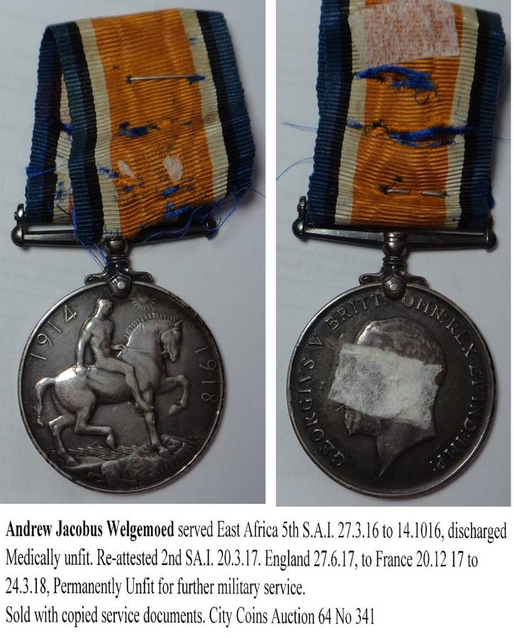 WW1 British War Medal to A/Cpl. A. J. Welgemoed 2nd S.A.I.