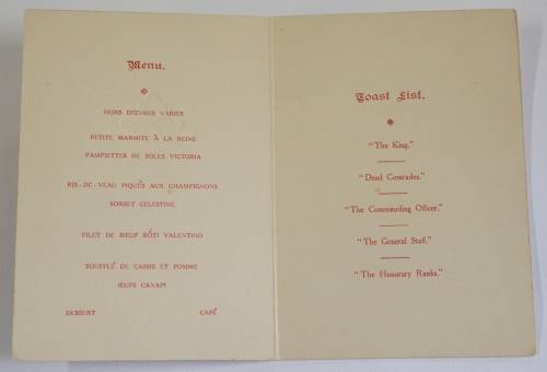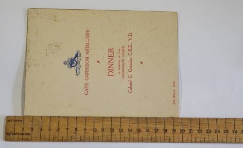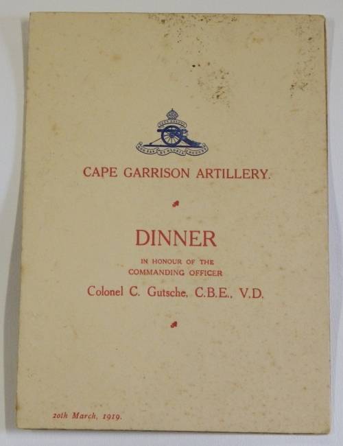 WW1 Cape Garrison Artillery Dinner menu in honour of commanding officer Colonel
