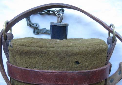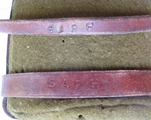 WW1 FELT COVERED OFFICERS WATER BOTTLE-BLUE ENAMEL WITH LEATHER CARRIER-THE CARRIER STAMPED SAPH-COM