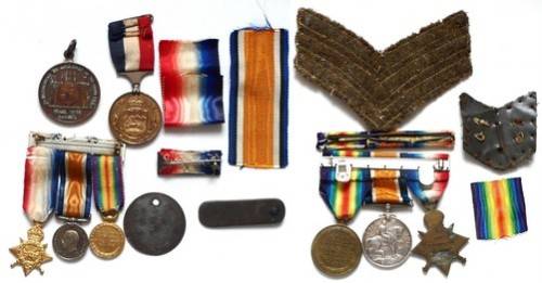 WW1 SET OF 3 MEDALS PLUS MINIATURES, RANK INSIGNIA,DOG TAG,+ INITIAL BADGE. PLUS 2 MEDALS