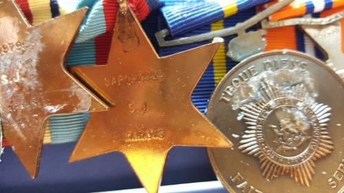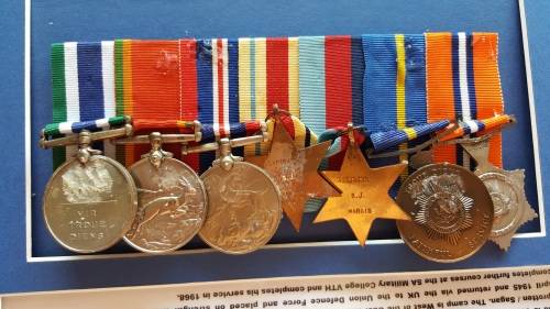 A full-size correctly named WW2 and Police medal group to WO Stephanus Jacobus Marais SAP number: 197959. Confirmed POW. See pictures of records below. Court mounted for display. PLEASE note: on the reverse of the medals there is some non-acidic clear silicone, probably to keep the medals in place. The medals are correctly named (see pictures) and are in good condition, no damage - my view. The POW status is also confirmed in King's book on the Police - see pictures.