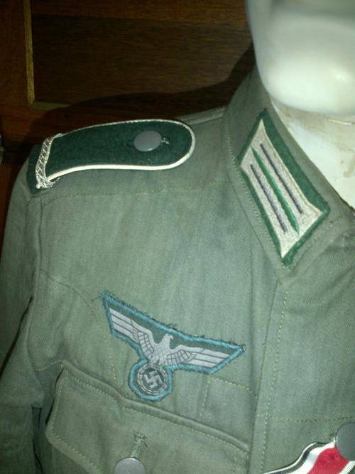 The M40 tunic was introduced in 1940, during the second year of the war, and incorporated a number of changes from the older M36 tunic. In this case, the chief difference is the use of herringbone twill - HBT, also known as denim or drillich - for use by Wehrmacht forces in the summer, as well as in the warmer Mediterranean climate.