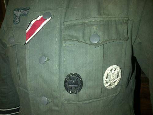 You are bidding on one WW2 German Wehrmacht Heer Landser M40 HBT Tunic, with associated awards. All items in this listing are replicas. The tunic is made from HBT, and sized to fit a 40" chest. Collar is somewhat tight, but was usually worn open in combat for better ventilation.