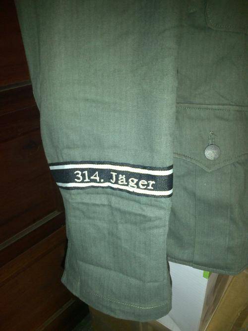 On the right sleeve, the tunic also carries a regimental cuff title for the 314th Jäger regiment. The Jäger units were light infantry units midway between the massive Infantry divisions and the lightly-equipped Gebirgsjäger (mountain troops) units. They relied on better speed (due to their lighter equipment) and better communication, as well as a higher percentage of automatic weapons, to gain a tactical advantage in urban and hilly/rough combat areas.