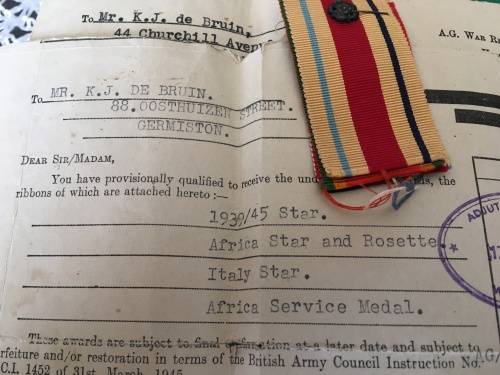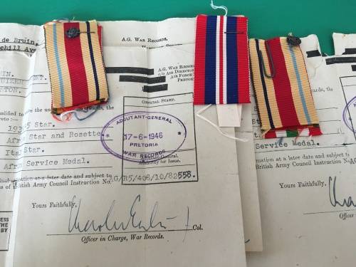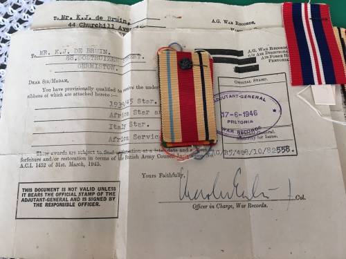 There are also 3 papers to K.J de bruin from AG war records air forse house Pretoria with 2 extra rossettes and riboons on them all for K.J de bruin.